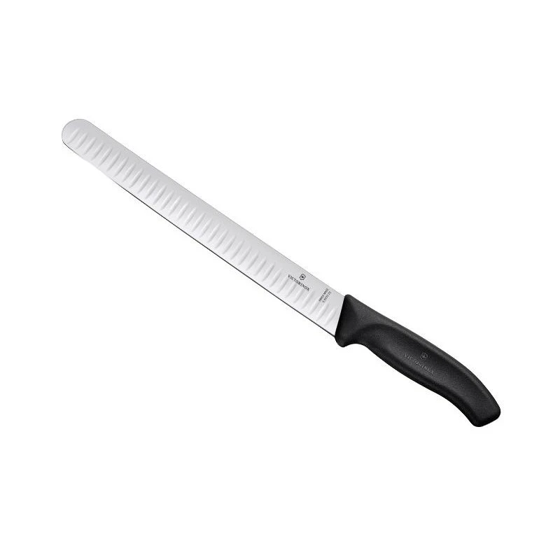 Ce couteau de cuisine Victorinox, modèle 6.8223.25B, série SwissClassic, est doté d’une grande lame de 25cm de longueur, en acier inoxydable, et présentant de nombreuses alvéoles afin de faciliter les découpes. Elle assure un tranchant net et précis du jambon, des rôtis, des dindes et bien d’autres aliments. Au-dessus des alvéoles, on retrouve bien sûr le logo Victorinox en référence au très célèbre fabricant Suisse.