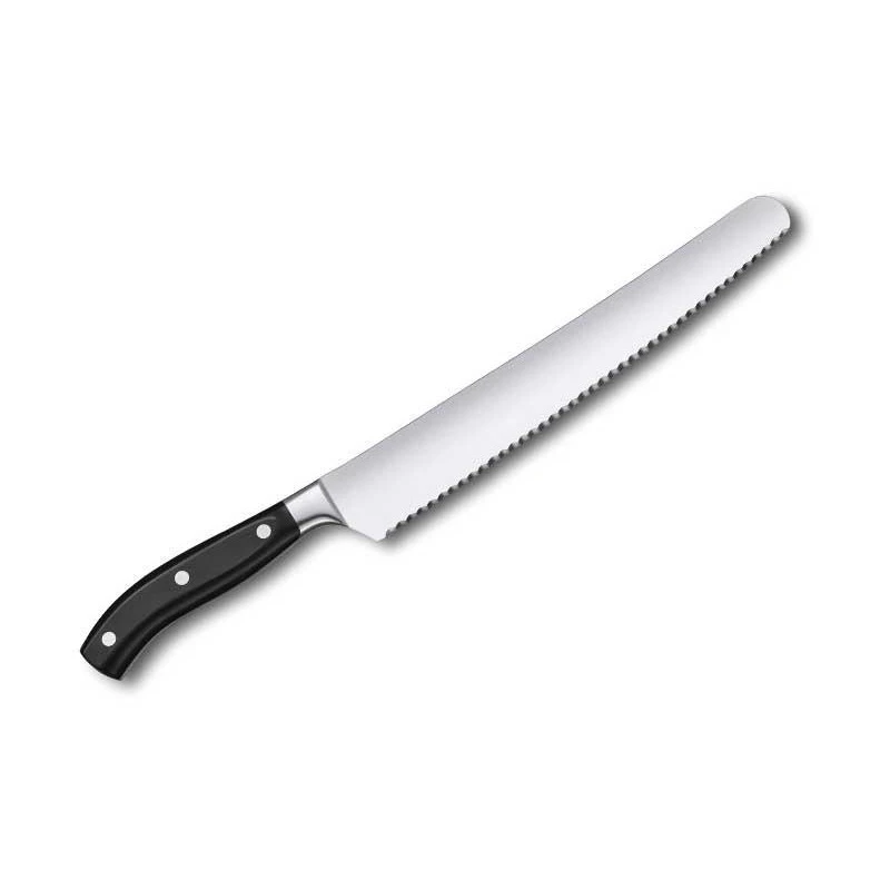 Style moderne et performances de haute voltige, voilà ce que vous offrira le couteau à pain Victorinox 7.7433.26G ! Issu de la prestigieuse série Grand Maître, il arbore un look ultra tendance par son manche noir en POM (polyoxyméthylène). Un matériau de la plus grande élégance qui assure aussi une parfaite compatibilité avec le lave-vaisselle. Qui plus est, sa forme ergonomique maximise le confort de prise en main. Vous aurez ainsi un plus grand contrôle sur la lame de 26cm de longueur forgée d’une seule pièce en acier inoxydable. Dentée, la lame tranche avec une incroyable aisance toutes les sortes de pains et viennoiseries. Des découpes qui seront toujours exécutées avec une précision extrême ! Possibilité de gravure sur lame en supplément (voir bouton ajouter une gravure).