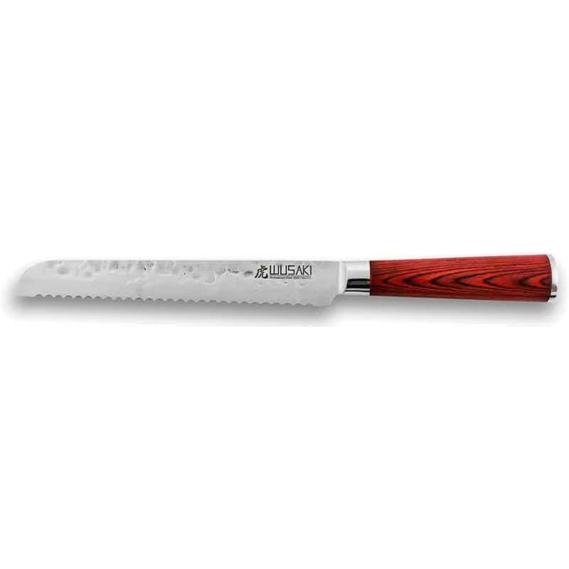 À la recherche d’un excellent couteau de cuisine Japonais pour la découpe de vos pains, brioches et viennoiseries ? Alors ne cherchez pas plus longtemps, ce couteau à pain Wusaki Pakka X50 est celui qu’il vous faut, en répondant exactement à toutes vos attentes. Porteur de la référence WU8018, ce modèle allie style et performance, et se dote d’une longue lame de 20cm de longueur fabriquée en acier inoxydable Allemand X50CrMoV15. Une lame résistante à la corrosion, martelée sur le-dessus pour le design, qui bénéficie d’un tranchant cranté afin de pouvoir découper/trancher toutes les sortes de pain sans le moindre effort. On aura à cœur de souligner le fait que la lame à dents est décorée par le logo Wusaki, avec inscription « Professional Steel X50CrMoV15 » indiquant clairement qu’il s’agit d’un acier professionnel.