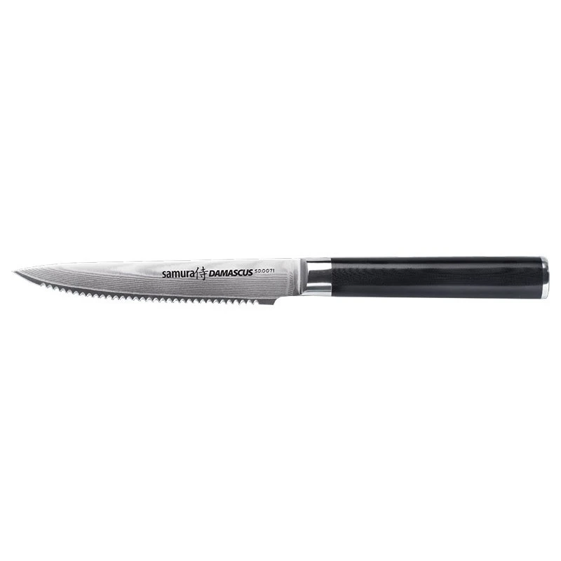 Pour couper les tomates comme un pro, l’ustensile de cuisine requis est sans grande surprise le couteau à tomates ! Celui de la série Damascus signé Samura aura le mérite de sublimer son utilisateur en plus d’offrir des coupes nettes et précises de vos tomates, poivrons, pommes, etc…L’élégance de son manche couplée aux lignes ondulées de sa lame formées par les 67 couches de damas en font une pièce d’un esthétisme à couper le souffle. Mesurant 120mm de long, sa lame à la denture fine est très efficace, permettant de couper la peau de la tomate sans en abîmer la chair. Décorée de l’inscription « Samura Damascus SD0071 », elle possède une pointe acérée pour ôter le centre de la tomate facilement. Le manche du couteau à tomates Damascus Samura est conçu en G10 : sa forme ronde et la douceur de sa surface favorisent la préhension. Pommeau comme mitre sont en acier pour plus de brillance et de robustesse. Le couteau à tomates Damascus Samura se lave exclusivement à la main.