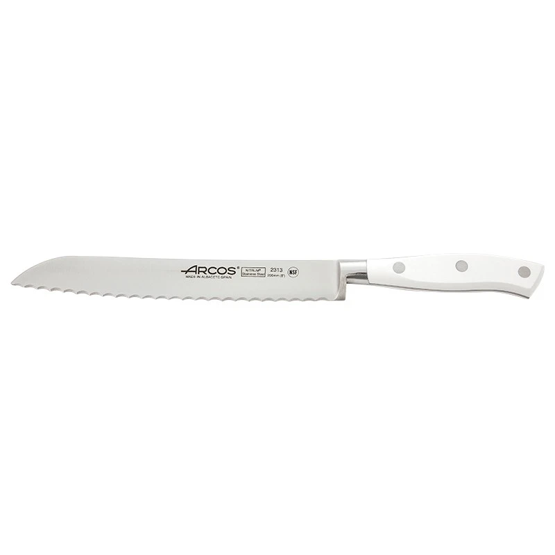 Le fabricant Espagnol Arcos vous propose ce couteau à pain issu de la gamme Riviera. Un couteau de cuisine qui se veut très moderne en raison de son manche blanc comme neige en POM ou polyoxyméthylène. Un matériau qui garantit une excellente résistance face aux produits corrosifs, mais aussi aux basses et hautes températures. La poignée blanche est également sublimée par des rivets en acier inoxydable, ainsi qu’une virole style Français.
