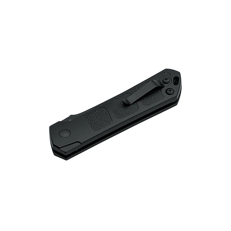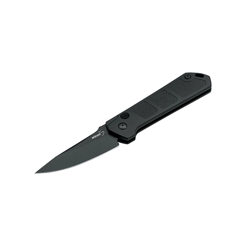 Très logiquement, le Böker Plus Kihon Auto All Black est doté d’un design entièrement noir, renforçant davantage le côté tactique. C’est un couteau automatique tactique, muni d’une lame noire de 8cm de longueur, en acier AUS-8, qui n’est pas sans rappeler une certaine épée Japonaise. Personnalisable, la lame noire est particulièrement tranchante, elle est aussi décorée par le logo Böker Plus en blanc afin de bien ressortir par contraste.