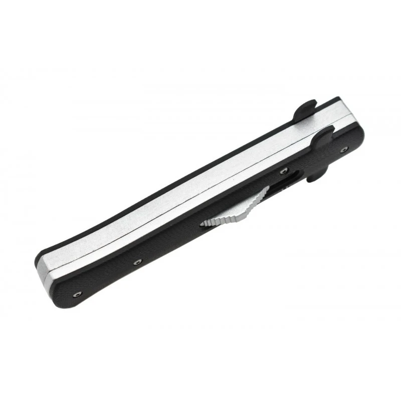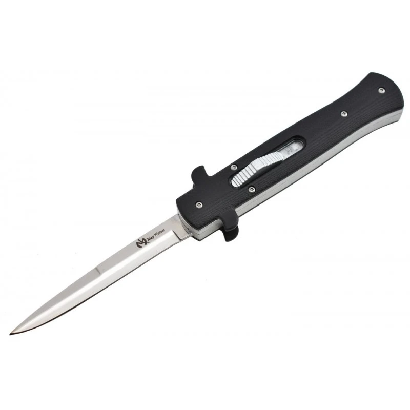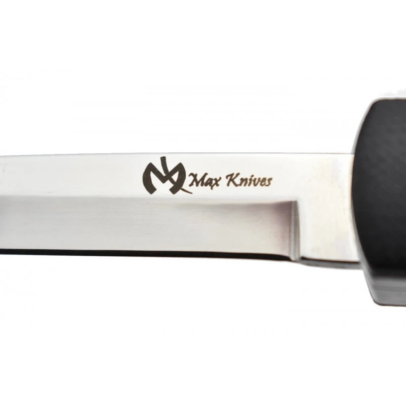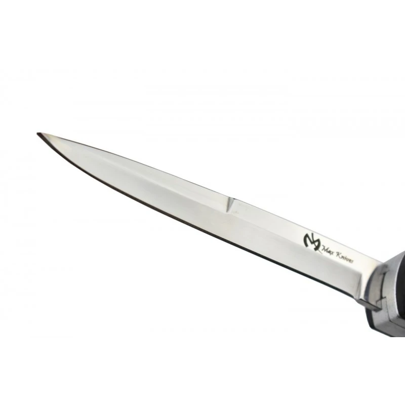 Le modèle Italian Style Max Knives MKO41 est un couteau automatique à ouverture frontale (OTF), qui vous l’aurez compris, arbore un look Italien. Comprenez que sa lame est fine et allongée, elle mesure ici 95mm de longueur et s’avère être conçue en acier inoxydable, un acier dont les propriétés lui permettent de bien résister à la corrosion ou encore rouille. On remarque également que la lame est décorée par le logo Max Knives : elle est aussi personnalisable par gravure. Le couteau automatique OTF double action MKO41 Italian Style, signé Max Knives, possède un manche en métal avec plaquettes de G10 coloris noir. Le bouton poussoir gris clair est facilement visible, ergonomique, il permet de déployer/rentrer la lame en toute simplicité. Les ailerons du manche apportent une petite touche design qui ne manquera pas de faire la différence.