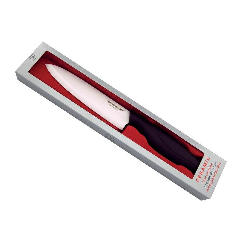 Vous êtes un chef de cuisine à la recherche d’un couteau céramique performant et fiable ? Alors ce modèle 442916 de chez TB est celui qu’il vous faut ! Un couteau de chef qui se dote, comme vous l’aurez compris, d’une lame en céramique blanche mesurant précisément 15cm de long. Rappelons que la céramique comporte de nombreux avantages, comme notamment le fait de ne pas rouiller, ni d’être attaquée par les acides des aliments. Autre point positif, elle ne transmet aucune odeur aux aliments tranchés ou découpés, ce qui s’avère être très hygiénique. Revers de la médaille, il faut être vigilant à ne pas l’utiliser sur des aliments trop durs type surgelés ou os … La lame en céramique blanche est sublimée par une inscription qui n’est autre que : « Le couteau du chef Ceramic« .