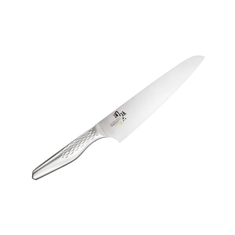 Le couteau de chef Kai appartenant à la série Seki Magoroku Shoso, se dote d’un manche de 125mm de long, en acier inoxydable 18-8, de forme ellipsoïdale symétrique pour une prise en main de très haute qualité, digne d’un chef de cuisine professionnel. Les motifs à losanges situés sur la poignée apportent énormément de style et d’élégance. Un couteau de cuisine Japonais très performant, et très résistant à la corrosion/rouille.