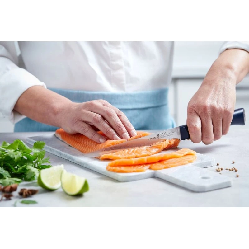 Le couteau effilé Opinel Intempora n°221 est idéal pour la préparation du poisson en bonne et due forme. Il dispose d’une fine lame, très flexible, de 18cm de long, fabriquée en acier inoxydable 12C27 modifié de Sandvik. Une lame qui assure un tranchant de qualité supérieure, et qui permettra au cuisinier de laisser s’exprimer tout son talent. Inciser, lever les filets, ôter la peau et la graisse des poissons mais aussi trancher les viandes, le foie gras et les terrines, autant d’actions qui seront désormais à votre portée. La lame est décorée par le logo Opinel, gravure possible d’un texte.