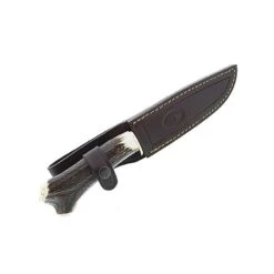 Le Böker Plus J-Bite, c’est aussi un manche noir en G10, riveté à deux reprises, tenant parfaitement dans la main grâce à sa petite taille (longueur approximative 85mm). Le couteau fixe est doté d’une sangle d’arrêt à l’extrémité de la poignée, elle s’attache à l’étui cuir noir fourni ce qui empêche le poignard de glisser volontairement. Mesdames, messieurs, vous avez face à vous un allié de choix pour toutes vos aventures Outdoor !