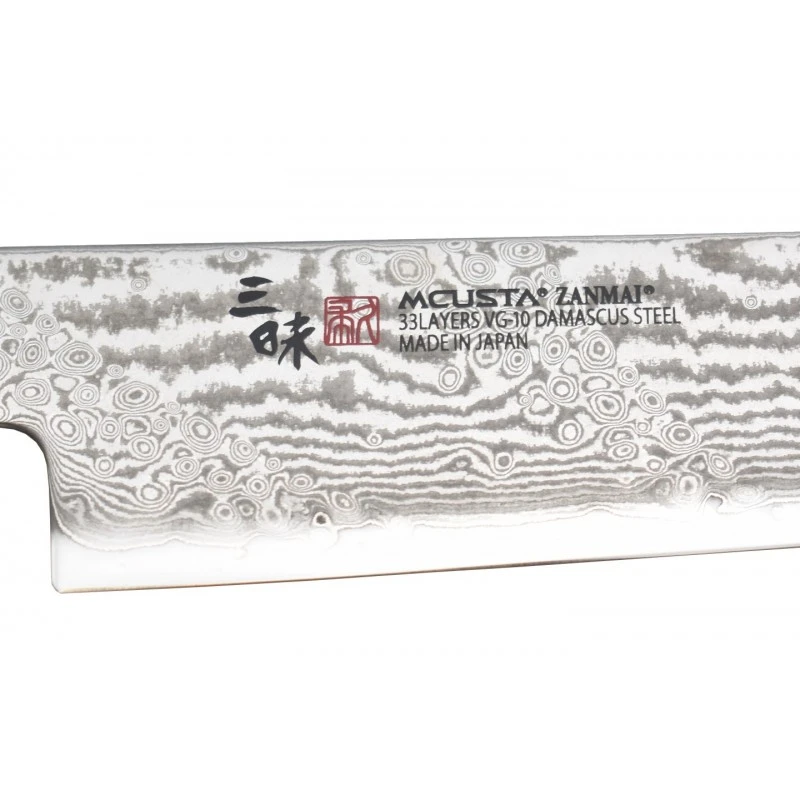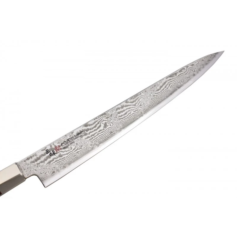 Dans le domaine de la cuisine, la marque Japonaise Mcusta est très populaire, c’est très clairement un gage de qualité. Ce modèle HZ2-3010DS Splash Hybrid Sujihiki possède une lame de 24cm de longueur qui se révèle être redoutable d’efficacité pour la préparation minutieuse des viandes et poissons. La lame possède un cœur en VG-10 entouré de couches d’acier damas afin d’être en parfaite adéquation avec la tradition Japonaise. La lame est de forme ogive et le tranchant poli miroir ce qui met particulièrement bien en avant les motifs Sanmai. Ce couteau de cuisine Japonais, Mcusta HZ2-3010DS Splash Hybrid Sujihiki 240, possède un manche noir en pakkawood stabilisé comprenant une mitre en alliage nickel-argent de haute qualité. Une élégante poignée dont le style vient parfaitement parfaire l’ensemble : une pièce des plus élégantes, ergonomiques mais aussi performantes ! Ce couteau Mcusta Sujihiki existe aussi en version lame 27cm.