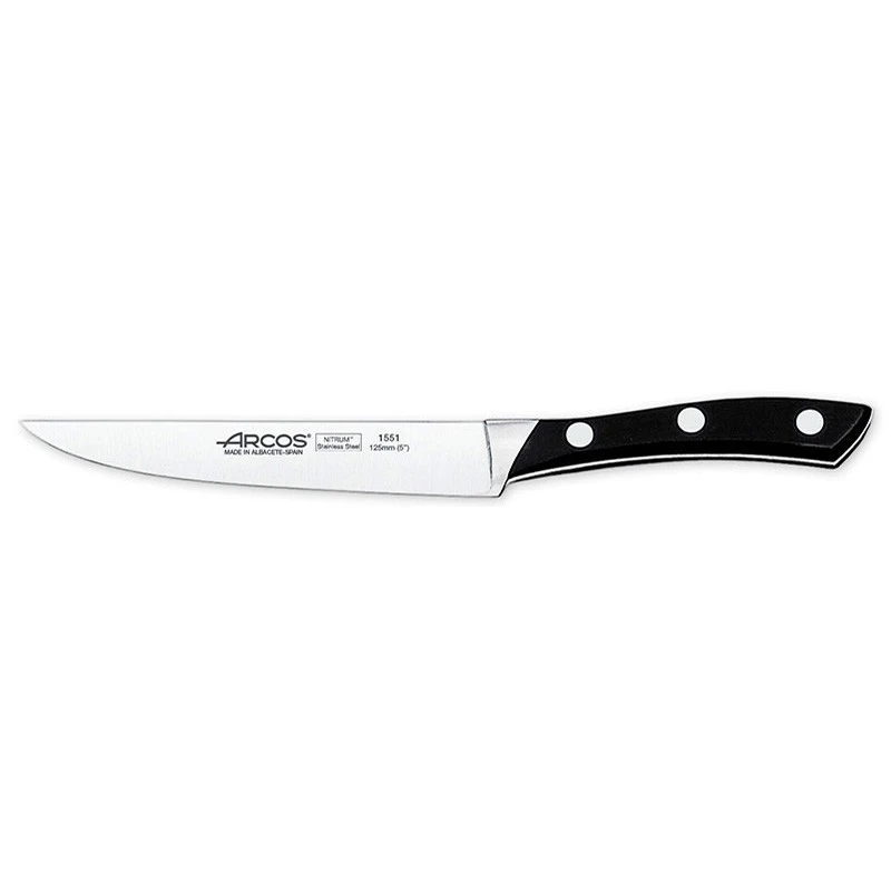 Ce couteau de cuisine Arcos Terranova, référence A155100, est idéal pour trancher ou encore éplucher les légumes. Il possède une grande lame de 125mm de long, fabriquée en acier inoxydable forgé AIF NITRUM. C’est un acier inox enrichi à l’azote offrant un excellent compromis entre tranchant et facilité d’affûtage. À noter que la longue lame pointue en bout est marquée par le logo Arcos, la coutellerie Espagnole spécialiste du couteau de cuisine !