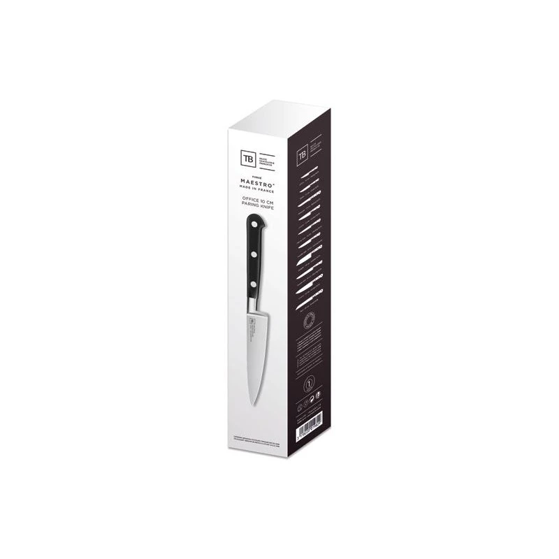À l’apparence moderne, ce couteau d’office TB Maestro Idéal intègre aussi un manche noir conçu en POM. Riveté pour un design toujours plus sophistiqué, le manche est aussi confortable à manipuler, permettant ainsi aux chefs de cuisine professionnels ou apprentis d’exécuter en permanence les gestes précis qui font la différence. Le couteau d’office TARRERIAS BONJEAN, un petit ustensile de cuisine bien pratique au quotidien ! Fabrication Française à Thiers.