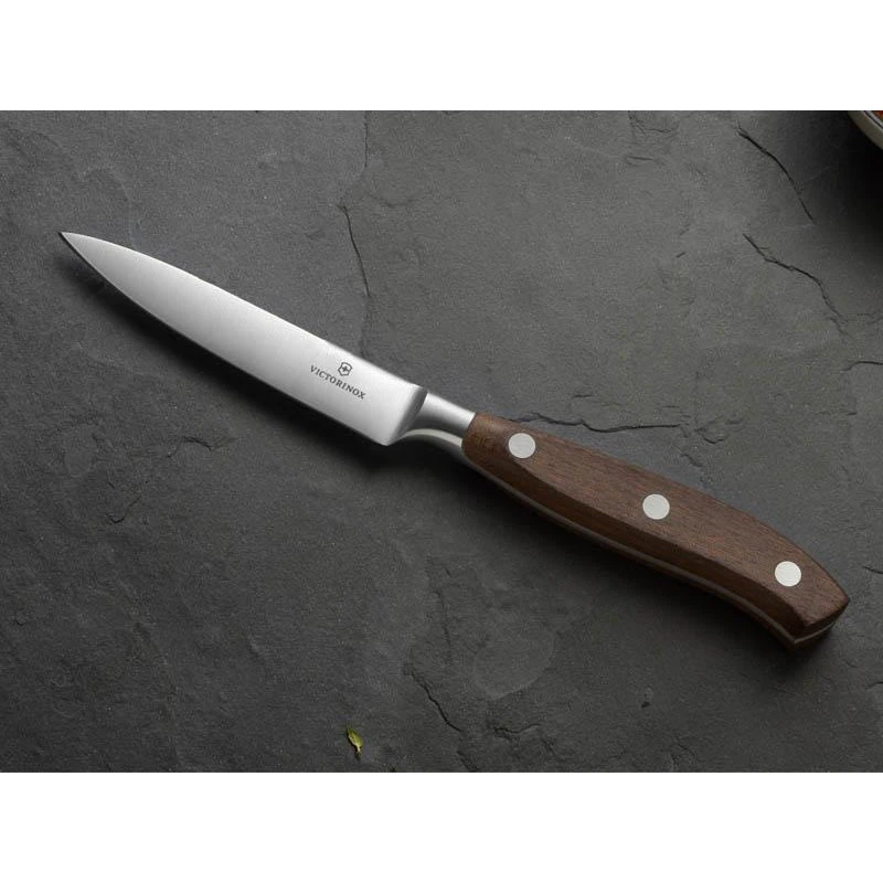 Ce couteau d’office appartient à la série Grand Maître Rosewood de la marque Suisse Victorinox. Porteur de la référence 7.7200.10G, ce couteau de cuisine professionnel possède notamment un manche de forme ergonomique en bois d’érable modifié. La poignée est rivetée ce qui ne manque pas d’apporter une note élégante, comme déjà dit sa forme assure une ergonomie aux petits oignons, elle est très confortable à manipuler, et ce, en toutes circonstances.