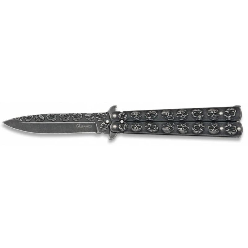 Mieux vaut ne pas avoir froid aux yeux pour utiliser ce couteau papillon Albainox Skull, référence 02184. Un balisong qui ne manque pas d’originalité, en raison de ses multiples décors motifs tête de mort. Nul doute que vous apprécierez également le couteau papillon Martinez Albainox Skull pour sa belle finition pierre. Sinon, ce modèle 02184 dispose d’une lame de 95mm de long, en acier inoxydable particulièrement résistant à la corrosion, sur laquelle on peut voir le logo Albainox, ainsi que des têtes de mort évidemment. Conçu en Espagne, par Albainox, ce couteau papillon bénéficie d’un joli manche lui aussi fabriqué en acier inoxydable. À offrir à tous les téméraires, qui n’ont pas peur d’une, ou plutôt plusieurs têtes de mort !