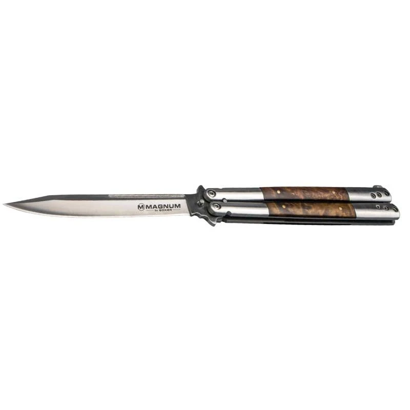 Ce couteau papillon Böker Magnum Balisong Wood Large est doté d’une lame en acier 440A de longueur 102mm. Elle est marquée du texte « Magnum by Böker » au recto et vous pouvez la personnaliser par le texte de votre choix au verso. Le manche lui, est fabriqué en acier inoxydable et bois, deux matériaux très complémentaires qui apportent une touche d’esthétisme au couteau papillon Böker référence 06EX405. Sachez que le manche mesure 125mm de longueur. Ce balisong est également très résistant puisqu’il résiste aux chocs de hauteur 1,5 mètres et moins.
