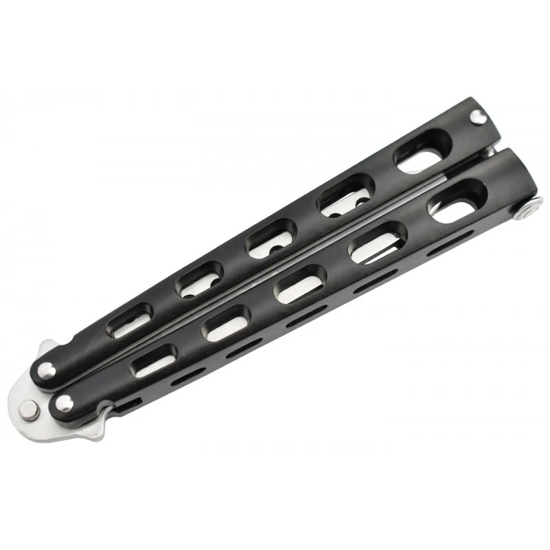 Le Max Knives P33BK est un couteau papillon destiné à l’entraînement, afin de se perfectionner au maniement du balisong. Il possède une lame sans tranchant, à bout arrondi, en acier inoxydable résistant à la corrosion, ajourée de nombreuses fois pour un style toujours plus marqué. Sur la face avant de la lame, on peut observer le logo Max Knives au-dessus des ajours, ce qui fera bien sûr très plaisir aux fans de la marque Max Knives. La lame assure des manipulations toujours très sûres afin que l’utilisateur ne vienne jamais se blesser à l’usage.