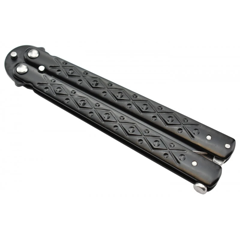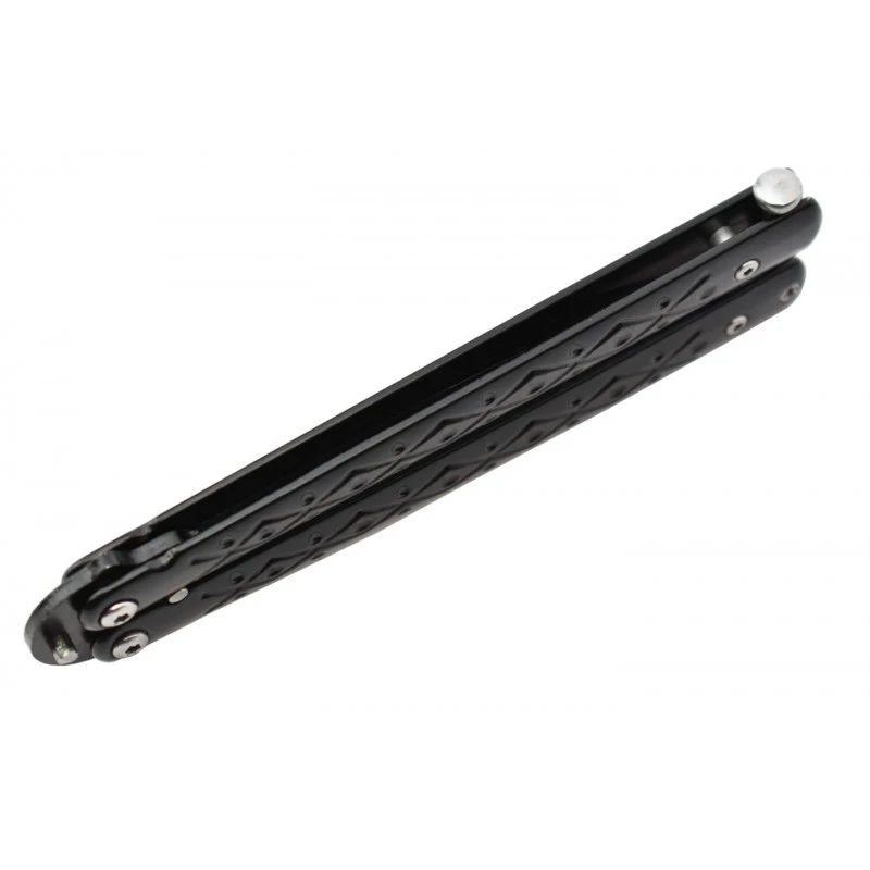 Le Max Knives P50B est un couteau papillon au style saisissant, et au rapport qualité/prix excellent comme c’est souvent le cas avec cette marque. Le manche du balisong est ici fait d’acier inoxydable noir enrichi de motifs linéaires entrecroisés ainsi que de cercles. Même si la beauté est quelque chose de subjectif, on peut toutefois dire que la poignée est des plus attrayantes. Séparable en deux parties comme tout couteau papillon qui se doit, elle mesure 117mm de longueur afin de se transporter facilement.