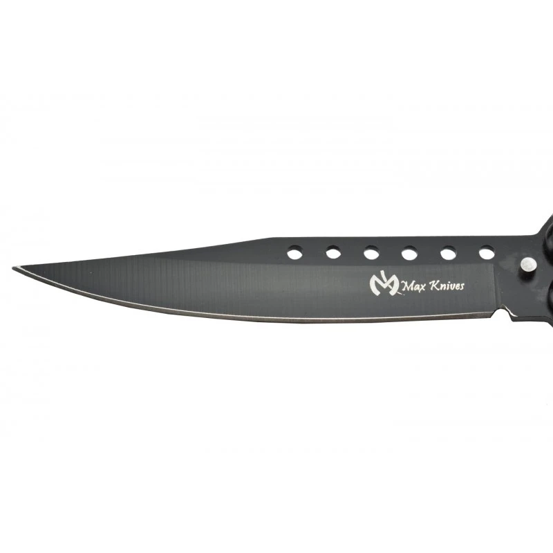 Le P50B Max Knives a une lame dont le style est dans la lignée de celui du manche. Elle est de couleur noire et s’avère être de forme spear point pour un aspect plus agressif, plus percutant. Fabriquée en acier inoxydable 3Cr13, la lame est ajourée sur la partie supérieure par des formes rondes. Juste en-dessous, on observe l’inscription Max Knives accompagnée du logo de la célèbre marque. Existe aussi en version silver.