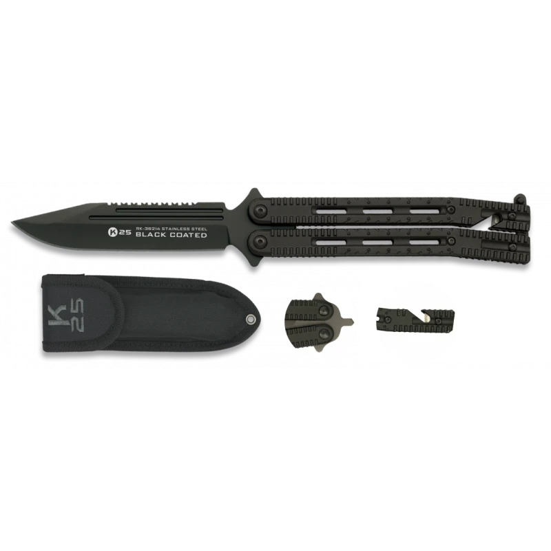 Un couteau papillon tactique signé K25 qui a du style. Tout d’abord son manche au design travaillé est pourvu d’un coupe ceinture en son extrémité (sur l’une des branches du balisong). Sa lame quant à elle, est dotée d’un revêtement titane, et de 2 tranchants : un lisse et un cranté. Une fois le couteau replié, un brise vitre se dévoile aux niveaux des articulations. Enfin, ce couteau papillon K25 est livré avec un étui en nylon, très pratique pour protéger votre balisong.