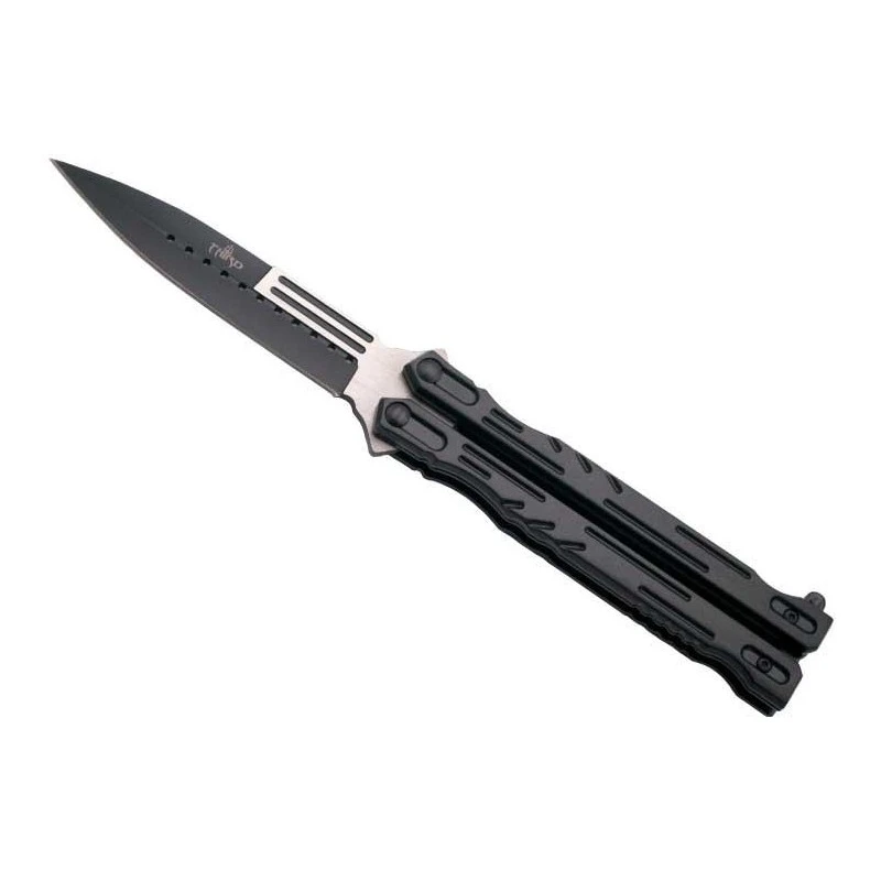 Ce couteau papillon de la marque Third possède un design tactique qui lui donne cette apparence si agressive. Sa lame de type Spear point avec revêtement noir est perforée de 11 petits cercles en son centre et possède deux gouttières parallèles sur chacunes de ses faces, des particularités esthétiques qui la rendent si originale. La large épaisseur du dos de la lame permet d’y poser son pouce pour effectuer des travaux de précision si besoin. La poignée ergonomique en aluminium est légère, solide et agréable en main. D’une longueur de 13.5cm, elle est décorée de multiples motifs creusés. Compact et léger, le balisong ref.TH.K2097 se transporte facilement dans une poche.