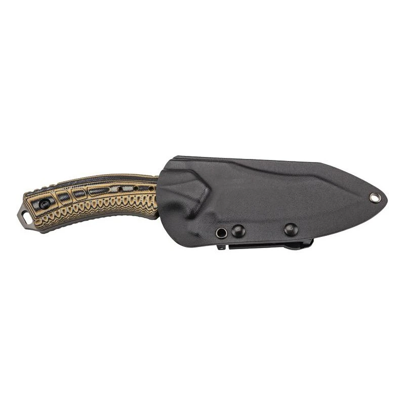 Le poignard Herbertz Top Collection 535412 est un puissant couteau doté d’une lame fixe, de type pleine soie, en acier inoxydable 440 avec revêtement titane gris. Les dentures partielles ainsi que son ajour lui confèrent un look très accrocheur, sa longueur est de 115mm. Cette même lame est marquée par l’inscription « Herbertz Top Collection« , il est possible de la personnaliser par gravure en supplément. Le poignard Herbertz 535412 se démarque aussi en raison de son manche aux multiples évidements, il est fabriqué en G10 coloris brun ainsi que noir. Offrant une grande variété de positions pour les mains, ce poignard intègre même un trou pour lacet en bout de poignée. Pratique, un étui Kydex robuste est compris dans le prix, tout comme le coffret cadeau dans le but d’offrir, de faire plaisir.