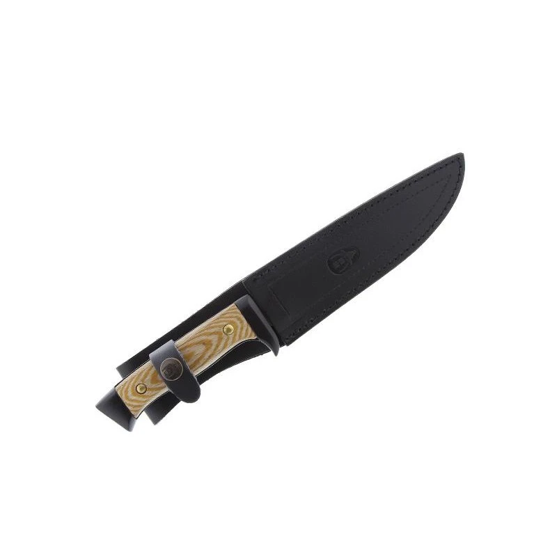 Avec son manche en stamina clair, difficile de ne pas remarquer ce poignard Muela « 3160 ». Il faut dire que le manche dispose d’un magnifique contraste avec le stamina clair (couches fines de bois + résine) ainsi que les mitres noires sur les deux extrémités du manche. En plus d’apporter une touche esthétique non négligeable au poignard, les mitres assurent également sa protection au quotidien. Il en va d’ailleurs de même pour l’étui de protection en cuir noir livré avec le poignard Muela « 3160 ». Mais ce modèle, c’est aussi une grande lame de 15cm de longueur en acier inoxydable 420, un acier tranchant et robuste. Marquée par le logo Muela (fabricant Espagnol d’articles de chasse), la lame est personnalisable par gravure (voir le bouton ajouter une gravure ci-dessous pour plus d’informations). De quoi pouvoir par exemple graver le poignard Muela « 3160 » par le nom et/ou le prénom de celui qui l’utilisera au quotidien pour partir à la chasse ou à l’aventure !