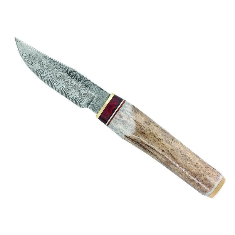 Le poignard Muela Bowie (référence 9248) dans sa version Collector. Il s’agit d’un poignard de collection muni d’une petite lame de 6cm de longueur fabriquée en acier damas. Il est composé à partir de 2 nuances d’acier : RWL 34 et PMC 27. Très élégante, la lame est aussi décorée par le logo Muela (fabricant Espagnol) en noir. Mais le poignard de collection Muela Bowie, c’est aussi un manche fabriqué essentiellement à base de bois de cerf véritable. Il faut bien noter la présence du mot « essentiellement » car le manche intègre aussi du stamina (bois et résine compressés à chaud). On peut le dire, comme pour la lame, le manche est très élégant et fera de nombreux adeptes. Livré en coffret parfait pour offrir, le poignard Muela Bowie 9248 est aussi vendu avec son bel étui en cuir façon iguane. Un modèle exceptionnel qui va ravir tous les collectionneurs fans de la marque Muela !