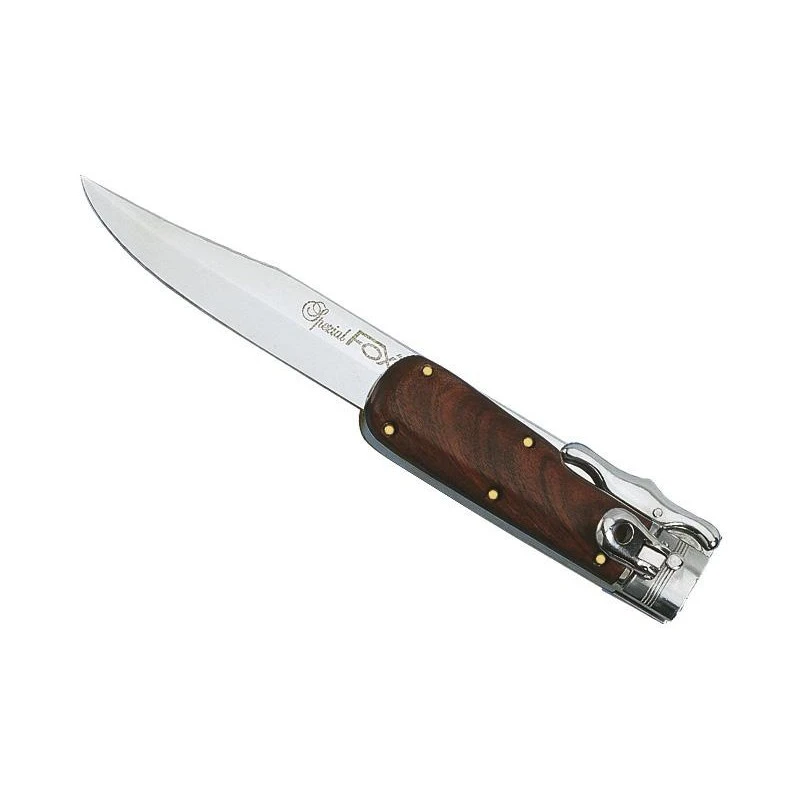 Ce poignard pliant Hunter référence 1648 signé Fox Production est destiné à tous les chasseurs, expérimentés ou débutants. Il possède une grande lame en acier inoxydable de 19cm de long dont l’ouverture et la fermeture sont commandées par un levier poussoir. La grande lame est marquée par la marque Fox : résistante notamment à la corrosion, elle est tranchante et se révélera très utile pour dépecer les animaux par exemple. De plus, ce poignard Fox spécial chasseur a l’avantage d’être pliable afin de rendre le transport plus facile : il tiendra facilement dans le sac à dos ou dans la poche. Au niveau du manche, ce poignard de chasse Fox Production est fabriqué en bois cerf véritable, un matériau noble qui allie élégance et solidité. Et pour couronner le tout, ce modèle Hunter est également livré avec son étui en cuir de protection : de quoi satisfaire les chasseurs qui pourront prendre soin en toutes circonstances de leur poignard favori.